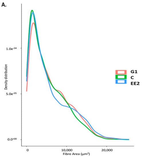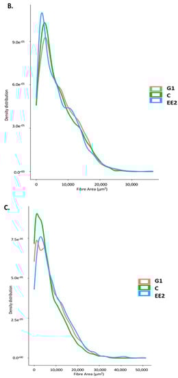 Size distribution of white muscle fibers (µm2) of the three experimental groups at the first stage (on day 45 of treatment) (A), at the second stage (79 days after treatment cessation) (B) and at the third stage (122 days after treatment cessation) (C). Red, green and blue lines correspond to the G1, C and EE2 groups, respectively.