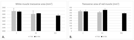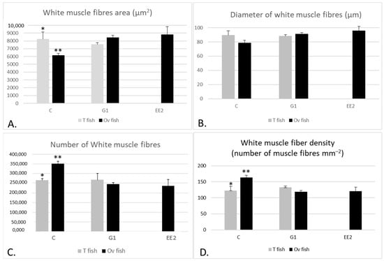 When comparing muscle cellularity of the Ov fish among the three groups, the largest size of white muscle fibers was observed in the EE2 group, followed by the G1 group, the C group showing the lowest values (p < 0.05) (Figure 5A,B). The number of fibers showed the opposite tendency to that described for the size of fibers (p < 0.05) (Figure 5C,D).