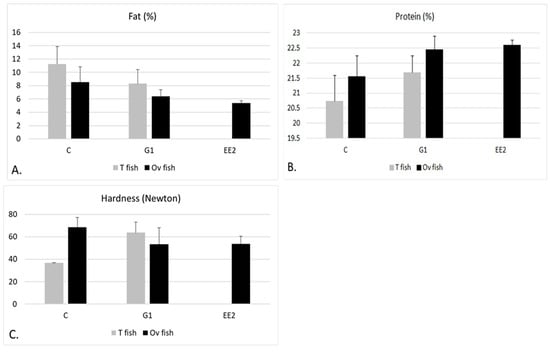 When comparing the muscle composition of T fish in the C group versus the G1 group at the end of the experiment, the fat content was found to be higher in T fish in the C group (p > 0.05) (Figure 7A). On the other hand, when comparing the values of T and Ov fish in the three groups, the fat content was lower in Ov than in T fish, the EE2 group showing the lowest values (p > 0.05). Protein content showed the opposite tendency to that described for fat content (Figure 7B). In relation to the hardness values, these were lower in T fish in the C group than in T fish in the G1 group (Figure 7C)—an observation that is consistent with the size of the fibers of both groups, previously described (Figure 5A,B). When comparing the hardness values among the Ov fish in the three groups, the EE2 and the G1 groups showed the lowest values (p > 0.05).