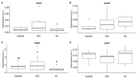(A–D) Gene expression of mstn2, myod1, mafbx and capn1, respectively, in the C, EE2 and G1 groups. The values that are represented in the graphs for each gene correspond to the results that were obtained jointly in all stages for each experimental group. a.u: arbitrary units. In (C), different letters indicate significant differences among the experimental groups.
