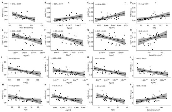 (A–P) Significant correlation plots between gene expression and muscle parameters from the three experimental groups (C, EE2 and G1). Pearson correlation index (r) and level of significance (p) are indicated for each plot. The values that are represented in the graphs correspond to the results that were obtained for each parameter considering all the stages of the experiment together. a.u: arbitrary units. BW: body weight (g); W: white muscle transverse area (µm2); R: red muscle transverse area (µm2); T: total transverse area of the myotome (µm2); A: area of white muscle fibers (µm2); D: minimum diameter of white muscle fibers (µm); H: hardness of the fillet (Newton); Dens: fibrillar density (number of muscle fibers mm–2).