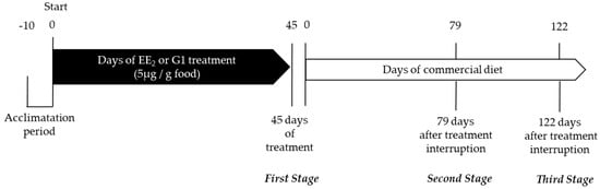 Schematic drawing of the experimental design. After 10 days of acclimatization, fish were subjected to three experimental conditions: control, EE2 or G1 treatment. In the EE2- and G1-treated groups, EE2 and G1 were incorporated into the commercial food. The control group (untreated fish) received the same commercial food without estrogenic compounds added. After 45 days, the EE2 and G1 treatments were interrupted. From that moment, the three experimental groups received a commercial diet. The samples were taken on day 45 of treatment (first stage) and 79 and 122 days after the cessation of the treatments (second and third stage, respectively) in the three groups.