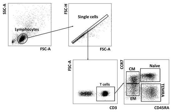 The data obtained were processed and presented using FlowJo X 10.0.7r2 (FlowJo LLC, Ashland, OR, USA). The cytofluorimetric analysis was performed after cell staining with the appropriate monoclonal antibodies. Lymphocytes were discriminated by gating the cells using a forward and side scatter cytogram. Then, single cells were selected using forward-scatter area vs. height. CD56− T cells, CD56+ T cells and NK cells subsets were identified by gating on CD56 and CD3. In CD3+ cells the following subsets were determined: naïve T cells (CCR7+CD45RA+), central memory T cells (CCR7+CD45RA−), effector memory T cells (CCR7−CD45RA−) and terminal effector memory T cells (CCR7−CD45RA+).