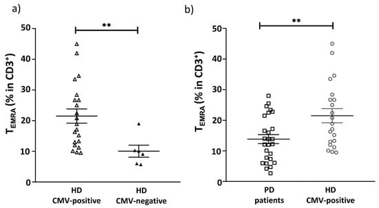 The figure shows the proportion of TEMRA cells among the CD3+ cell population. (a) The proportion of TEMRA cells in CMV-positive and CMV-negative individuals in the HD group. (b) The proportion of TEMRA cells in PD patients and CMV-positive individuals in HD group. Solid line—the mean (±SEM), ** p < 0.01.
