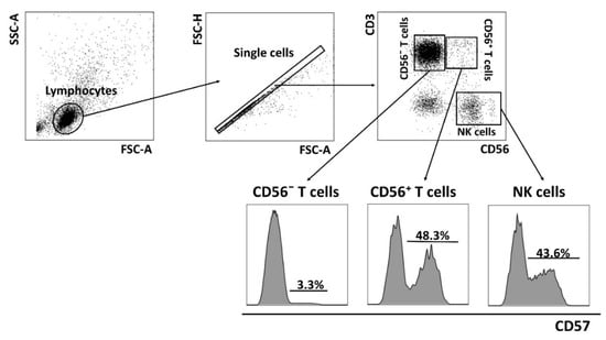 CD57 expression analysis on T cells and NK cells. Gating strategy and representative data of CD57+ cell proportions in CD56− T cells (CD3+CD56−), CD56− T cells (CD3+CD56+) and NK cells (CD3−CD56+) are presented.
