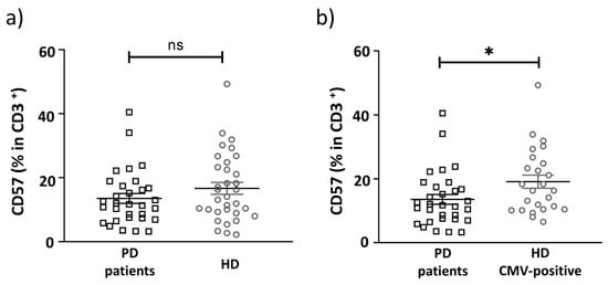 The proportion of CD57+ cells among all CD3+ T cells in PD patients and HD group. Comparative analysis of the CD57+ cell percentage in CD3+ T cells: (a) between PD patients and HD group, which included CMV-positive and CMV-negative donors; (b) between PD patients and only CMV-positive individuals in the HD group. Solid line—the mean (± SEM). n.s. non-significant, * p < 0.05.