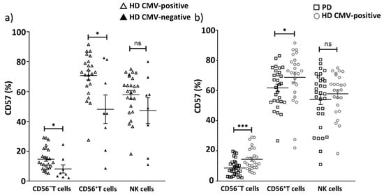 CD57+ cells (%) content among T cells and NK cells, depending on CMV infection. Comparing CD57+ cell percentage in CD56− T cells, CD56+ T cells and NK cells (a) between CMV-positive and CMV-negative donors in HD group; (b) between PD patients and CMV-positive individuals in HD group. Solid line—the mean (± SEM). n.s. non-significant, * p < 0.05, *** p < 0.001.