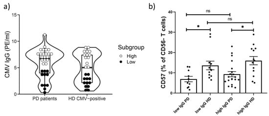 Then, PD patients and CMV-positive individuals from HD groups were divided into subgroups with low and high IgG values. The following subgroups were formed: low IgG PD; high IgG PD; low IgG HD; high IgG HD (Figure 6a). In both low and high IgG PD patient subgroups a reduced proportion of CD57+ cells in the CD56− T cell subset compared to low and high IgG HD subgroups was observed (6.9 vs. 13.6, p = 0.02; 9.3 vs. 15.9, p = 0.01, respectively). However, no differences in the proportion of CD57+ cells in CD56− T cells between low and high IgG subgroups were found between the PD patient group and in the HD group (6.9 vs. 9.3, p = 0.3) (13.6 vs. 15.9, p = 0.4) (Figure 6b). Thus, we confirmed that the CD57+CD56− T cell subset decreased in PD patients compared with CMV-matched HDs. This reduction was independent of CMV IgG values.