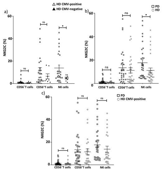 Since the immune response to CMV often leads to the accumulation of T and adaptive-like NK cells expressing the activating receptor NKG2C [], we analyzed the proportion of the NKG2C+ cells in the CD56− and CD56+ T cell fractions and in the NK cells in PD patients and the HD group. As expected, the proportion of NKG2C+ NK cells was higher in CMV-positive donors then in CMV-negative donors in the HD group (13.9 vs. 4.9, respectively, p = 0.04). There was a tendency towards an increased level of NKG2C-expressing T cells, especially, the CD56+ T cells subset in CMV-positive HD compared to CMV-negative HD (Figure 7a), although the difference was not significant, possibly, due to the small size of CMV-negative group. Next, we compared the proportion of cells expressing the activating receptor NKG2C in the CD56− T cells, CD56+ T cells and NK cells subsets in PD patients and the HD group. The proportion of NKG2C+ NK cells was higher in PD patients than in the HD group (Figure 7b, Table 4), which was not surprising because individuals with PD were 100% infected with CMV. At the same time, no difference in NKG2C+ NK cell level was found between healthy CMV-positive individuals and the PD patient group. No alterations in the proportion of NKG2C+ cells among CD56− and CD56+ T cell subsets between CMV-positive cohorts of HDs and PD patients were found (Figure 7c). Thus, the CMV-induced formation of NKG2C-expressing subsets of NK cells and T lymphocytes was not altered in PD.