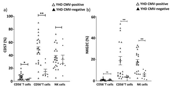 The proportion of CD57+ and NKG2C+ cells in CMV-positive and CMV-negative young healthy individuals: (a) The level (%) of CD57+ cells among CD56− and CD56+ T cells and NK cells; (b) Percentages of NKG2C+ cells in CD56− T cells, in CD56+ T cells and in NK cell subsets. Solid line—the mean (±SEM). n.s. non-significant, * p < 0.05, ** p < 0.01.