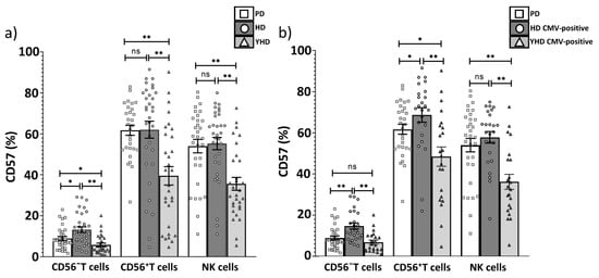 As expected, the proportion of CD57+ cells was lower in both CD56− and CD56+ T cell subsets, and in NK cells in the group of YHD compared with PD patients and HDs groups (Figure 9a). As we described above, the proportions of CD57+ cells in CD56− T cell was reduced in PD patients vs. CMV-positive healthy individuals. Interestingly, there were no significant differences in the proportion of CD57+CD56− T cells in the PD patients vs. CMV-positive individuals from the YHD group (7.0 vs. 5.5, p = 0.2). At the same time the proportions of CD57+CD56+ T cells and CD57+ NK cells has remained increased in the PD patients vs. CMV-positive individuals from YHDs (61.8 vs. 48.4, p = 0.02; 54.0 vs. 36.2, p = 0.0007, respectively). (Figure 9b). Thus, the phenomenon of the reduction in CD57+CD56− T cells in PD patients was not mediated by age-related components.