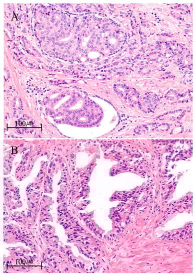 - Humphrey, P.A.; Moch, H.; Cubilla, A.L.; Ulbright, T.M.; Reuter, V.E. The 2016 WHO Classification of Tumours of the Urinary System and Male Genital Organs-Part B: Prostate and Bladder Tumours. Eur. Urol. 2016, 70, 106–119. [Google Scholar] [CrossRef] [Green Version]