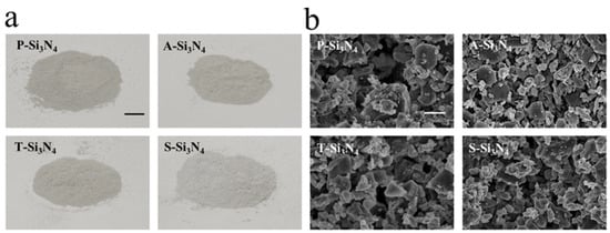 Characterization of Si3N4. (a) Macroscopic images of Si3N4. Scale bar = 5 mm. (b) Field emission scanning electron microscopy (FE-SEM) images of Si3N4. Scale bar = 10 µm. (P-Si3N4: Pristine Si3N4, A-Si3N4: Acid-treated Si3N4, T-Si3N4: Thermal-treated Si3N4, S-Si3N4: Sintered Si3N4 with 3 wt.% Y2O3).