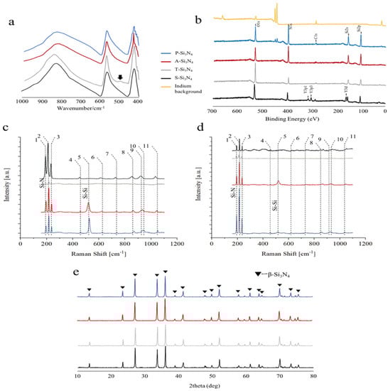 (a) Attenuated total reflectance−Fourier transform infrared spectroscopy (ATR−FTIR) spectra of Si3N4. Arrows: Si-O bonds. (b) X−ray photoelectron spectroscopy (XPS) spectra showing the elements contained in the manufactured Si3N4. (c) Raman spectroscopy results with green excitation sources. (d) Raman spectroscopy results with near infra-red excitation sources. (e) X−ray diffraction (XRD) pattern of Si3N4 crystals (P-Si3N4: Pristine Si3N4, A-Si3N4: Acid-treated Si3N4, T-Si3N4: Thermal-treated Si3N4, S-Si3N4: Sintered Si3N4 with 3 wt.% Y2O3).