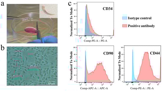 Characterization of primary rat dental pulp cells (rDPCs). (a) Mandibular incisors were extracted from rats for isolating rDPCs. (b) Microscopic examination showed a fibroblast−like morphology in fourth passage rDPCs. Scale bar = 50 µm. (c) Immunophenotype assay by flow cytometric analysis.