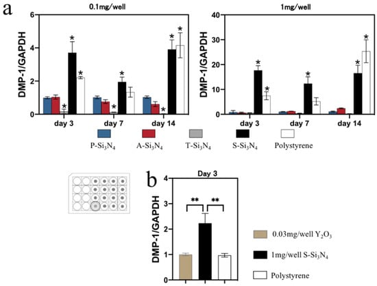 Real-time qPCR to detect the expression of odontoblast-specific genes. (a) Dentin Matrix Acidic Phosphoprotein (DMP-1) expression at 3, 7, and 14 days on plates coated with P-, A-, T-, S-Si3N4. (b) DMP-1 expression at 3 day on plates coated with 1 mg/well of S-Si3N4 (3 wt.% Y2O3 added) and Y2O3 (0.03 mg/well). Data are presented as the mean ± SD (n = 3). The differences of mean values among the test group were evaluated at one-way analysis of variance and Tukey’s multiple comparisons test. (a) * p < 0.05: vs. the P-Si3N4 group; (b) ** p < 0.01: comparison among all groups. (P-Si3N4: Pristine Si3N4, A-Si3N4: Acid-treated Si3N4, T-Si3N4: Thermal-treated Si3N4, S-Si3N4: Sintered Si3N4 with 3 wt.% Y2O3).