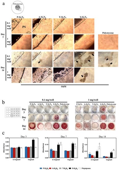 Mineralized nodule-like structures could be found in the wells with S-Si3N4, but not in the wells of other Si3N4s except for the 0.1 mg/well A-Si3N4 (arrows in Figure 6a). The wells treated with S-Si3N4 showed increased alizarin red staining at earlier time points compared to other Si3N4-coated wells (Figure 6b,c). Conversely, there was little red staining on and around T-Si3N4 subjected with thermal treatment even after 14 days of cell culture, which was weaker than that observed with P-Si3N4.