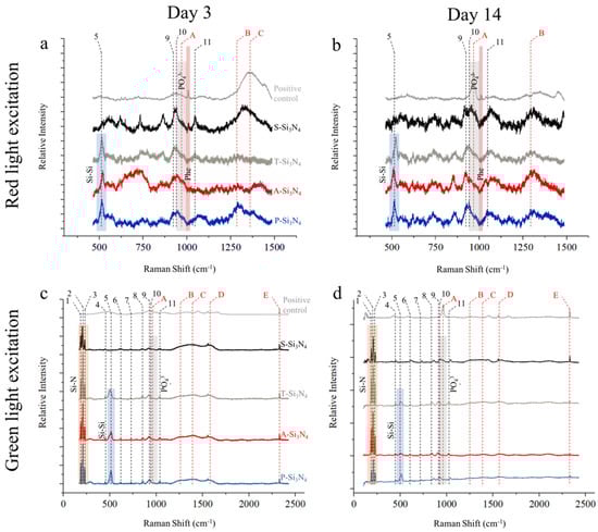 Raman analyses performed after 3 and 14 days of in vitro culture are shown in Figure 7. On day 3, with the exception of S-Si3N4 and the positive control, spectra obtained with red light excitation (Figure 7a) showed a prominent silicon band at about 520 cm−1, as previously observed in Figure 2c,d. Two bands related to Si3N4 were clearly visible at about 900 cm−1, followed by a shoulder band (A), which was caused by PO43- vibrations in bone apatite. At higher Raman shifts, a band related to collagen amide II (B) could be observed, particularly on the P-Si3N4 sample, whereas the last band at about 1380 cm−1 was derived from the glass substrate. The band at about 1004 cm−1 and highlighted in red is related to the presence of phenylalanine and was only visible with the positive control and with the S-Si3N4 sample. On day 14 (Figure 7b), the relative intensity of the bands (A) and (B) increased for all samples, particularly for the positive control and for S-Si3N4. The phenylalanine signal is barely visible in S-Si3N4, but is clearly observed in the positive control.