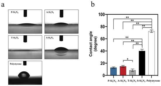 The surface wettability of materials strongly affects cell adhesion []. The contacts angle of the S-Si3N4 surface was significantly higher than that of the surfaces of other Si3N4s (Figure 8).