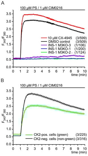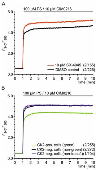 2.2. CK2 Phosphorylation Inhibits TRPM3-Mediated Ca2+ Entry