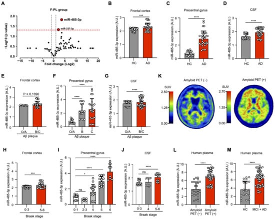 miR-485-3p is overexpressed in Alzheimer’s disease patients. (A) Results of differentially expressed miRNA analysis using founder-plasma samples from patients with AD (all patients were amyloid-PET positive, n = 3) and healthy controls (all subjects were amyloid-PET negative, n = 3). The red horizontal dotted line indicates p = 0.05. The two grey vertical dotted lines represent −1 and +1. Eighty-four miRNAs were normalized using 8 reference genes. (B–D) Expression of miR-485-3p in the human frontal cortex by real-time PCR (healthy control [HC] n = 8; patients with AD n = 7) (B), precentral gyrus (healthy control [HC] n = 6; patients with AD n = 8) (C), and cerebrospinal fluid (CSF) (healthy control [HC] n = 6; patients with AD n = 7) (D). Data obtained across three independent experiments are expressed as mean ± SD. (E–G) Expression patterns of miR-485-3p in the frontal cortex by real-time PCR (O/A n = 2; B/C n = 7) (E), precentral gyrus (O/A n = 4; B/C n = 10) (F), and CSF (O/A n = 3; B/C n = 10), (G) depending on the level of Aβ plaque accumulation. Level O/A means no or low densities of amyloid deposits in the isocortex, particularly in the basal portions of the frontal, temporal, and occipital lobes. Level B shows an increase in amyloid deposit levels in almost all isocortical association areas; only the primary sensory areas and primary motor field remained almost devoid of deposits. Level C is mainly characterized by virtually all isocortical areas being affected; deposits in the hippocampus show the same pattern as those in Level B. Data obtained across three independent experiments are expressed as mean ± SD. (H–J) Expression patterns of miR-485-3p in the frontal cortex by real-time PCR (stages 0 to 3: n = 8; stages 5 to 6 n = 7) (H), precentral gyrus (stages 0 to 1: n = 3; stages 2 to 3: n = 2; stages 4: n = 4; stage 5: n = 3; stage 6: n = 2) (I), and CSF (stages 0 to 3: n = 6; stages 4: n = 2; stages 5 to 6: n = 5) (J), depending on Braak stage. Data obtained across three independent experiments are expressed as mean ± SD. (K,M) Amyloid-PET images and standard uptake values (SUVs) of two clinical samples. Each SUV is displayed as a rainbow bar on the left. The images were obtained using a GE Discovery PET/CT 690 as a scanner and florbetaben as a tracer (K). Expression of miR-485-3p in plasma exosomes according to amyloid PET images (amyloid-PET-negative patients n = 14; amyloid-PET-positive patients n = 25) (L). Data obtained across three independent real-time PCR experiments are expressed as mean ± SD. Expression of miR-485-3p in plasma exosomes according to cognitive diagnostic results (healthy control n = 10; MCI patients n = 17; patients with AD patients n = 12) (M). Data obtained across three independent real-time PCR experiments are expressed as mean ± SD. For the frontal cortex (B,E,H), six repeat tests were performed per sample. In the case of the precentral gyrus (C,F,I), four repeat tests were performed per sample. In the case of CSF (D,G,J), nine repeat tests were performed per sample. For plasma (L,M), an average of 1.92 repeat tests per sample was performed. * p < 0.05; *** p < 0.001, **** p < 0.0001 (two-tailed t-test).