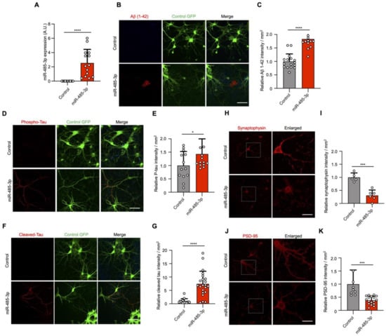 miRNA-485-3p induces accumulated Ab plaque, phosphorylated tau, cleaved tau, and reduced synaptophysin and PSD-95 conditions in primary mouse neurons. (A) After lentivirus-derived miR-485-3p transduction, miR-485-3p expression in primary mouse neurons was analyzed by real-time PCR (n = 14; data obtained across three independent experiments are expressed as mean ± S.E.M.). (B,C) Aβ 1–42 plaque immunofluorescence images of primary mouse neurons after lentivirus-derived miR-485-3p transduction (B). Scale bars, 20 μm. Data are representative of three independent experiments. Quantification of the Aβ 1–42 intensity (C) (two-tailed t-test; lenti-control n = 16, lenti-miR-485-3p n = 17; data are expressed as mean ± S.E.M. representing 1–5 randomly sampled regions, pooled from three independent experiments). (D,E) Phospho-tau immunofluorescence images of primary mouse neurons after lentivirus-derived miR-485-3p transduction (D). Scale bars, 20 μm. Data are representative of three independent experiments. Quantification of the phospho-tau intensity (E) (lenti-control n = 13, lenti-miR-485-3p n = 15; data are expressed as mean ± S.E.M. representing 1–5 randomly sampled regions, pooled from three independent experiments). (F,G) Cleaved tau immunofluorescence images of primary mouse neurons after lentivirus-derived miR-485-3p transduction (F). Scale bars, 20 μm. Data are representative of three independent experiments. Quantification of the cleaved tau intensity (G) (two-tailed t-test; lenti-control n = 15, lenti-miR-485-3p n = 22; data are expressed as mean ± S.E.M. representing 1–5 randomly sampled regions, pooled from three independent experiments). (H–K) Synaptophysin (H) or PSD-95 (J) immunofluorescence images of primary mouse neurons after lentivirus-derived miR-485-3p transduction. Scale bars, 20 μm. Data are representative of three independent experiments. Quantification of the synaptophysin (I) or PSD-95 (K) intensity (two-tailed t-test; synaptophysin, lenti-control n = 5, lenti-miR-485-3p n = 6; PSD-95, lenti-control n = 9, lenti-miR-485-3p n = 17; data are expressed as mean ± S.E.M. representing 1–5 randomly sampled regions, pooled from three independent experiments). * p < 0.05; *** p < 0.001; **** p < 0.0001 (two-tailed t-test).