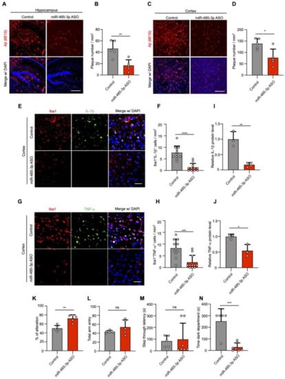 Immunohistochemistry with Iba1 (microglia-specific calcium-binding protein) and antibodies against IL-1β or TNF-α showed that IL-1β and TNF-α levels in microglia were markedly attenuated in miR-485-3p ASO-injected 5XFAD mice (Figure 3E–H). Similar results were obtained for the protein expression of IL-1β and TNF-α in the cortex of miR-485-3p ASO-injected 5XFAD mice (Figure 3I,J), suggesting that the miR-485-3p ASO reduced proinflammatory responses via microglial inactivation.