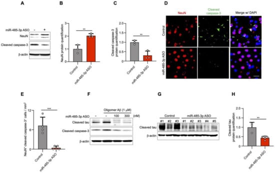 Immunohistochemistry showed that the expression of cleaved caspase-3 in neuronal cells was markedly decreased in miR-485-3p ASO-treated 5XFAD mice compared with that in control-treated 5XFAD mice (Figure 4D,E). To elucidate whether the reduction in cleaved caspase-3 levels was associated with cleaved tau, primary murine cortical neurons were simultaneously transfected with miR-485-3p ASO and treated with oligomeric Aβ. The activation of both cleaved caspase-3 and cleaved tau decreased in a miR-485-3p ASO dose-dependent manner (Figure 4F). Cleaved tau expression was also decreased in the brains of miR-485-3p ASO-injected 10-month-old 5XFAD mice (Figure 4G,H). These results suggested that the miR-485-3p ASO reduced apoptosis, effectively reducing tau pathology in AD.
