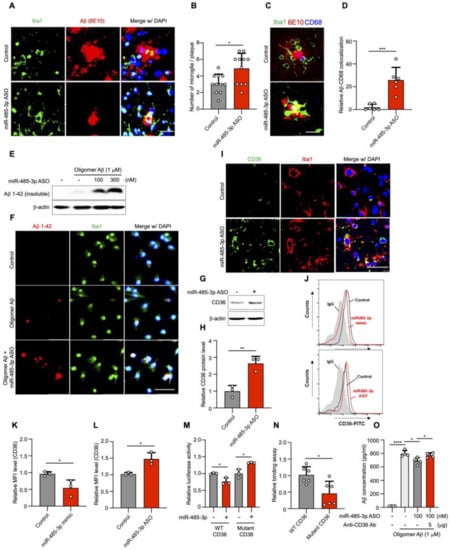 CD36 contributes to Aβ phagocytosis in microglia [,,]. To elucidate whether CD36 contributed to Aβ phagocytosis upon treatment with miR-485-3p ASO, we examined the expression of CD36 in 5XFAD mice. The protein expression of CD36 in the brain (Figure 5G,H) or Iba1-positive microglia (Figure 5I) was higher in miR-485-3p ASO-injected 8-month-old 5XFAD mice than in control mice. CD36 expression was decreased in miR-485-3p-transfected primary glial cells, compared with that in control cells (Figure 5J,K); miR-485-3p ASO transfection also elevated CD36 expression, compared with the expression in the control (Figure 5J,L).