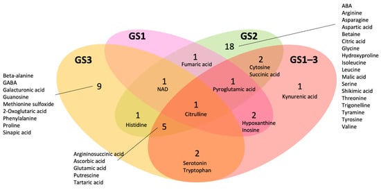 | Metabolites | GS1 | GS2 | GS3 | GS 1–3 | Metabolites | GS1 | GS2 | GS3 | GS 1–3 |