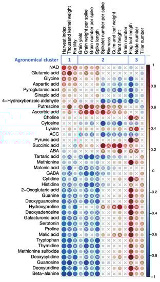 2.5. Correlation with the Altered Metabolite Concentrations and Agronomic Traits