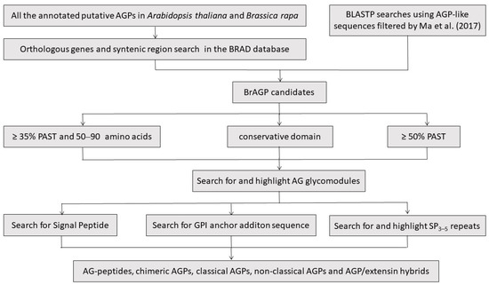 All the annotated putative BrAGPs in B. rapa were gathered and summarized based on previous studies, including 33 classical AGPs, 28 AG-peptides, three Lys-rich classical AGPs, 33 FLAs and 48 PLAs (28 BrENODLs, 11 BrUCLs, 8 BrSCLs and 1 unknown PLA) (Table S1) [51,55,56]. Those CAGPs that were not defined as an AGP for lacking N-terminal signal peptide came back in our consideration. The orthologous genes of all the annotated AtAGPs were searched in the Brassica database (BRAD, http://brassicadb.cn, V3.0, accessed on 1 December 2021). In this study, the total number of AtAGPs was 151 and included 23 classical AGPs, three Lys-rich classical AGPs, 16 AG-peptides, 22 FLAs, 28 PLAs, 22 XYLPs, 32 other CAGPs, four HAEs and one non-classical AGP (Table S2) [3,6,10,16,57]. In addition, BLASTP was performed in the BRAD using AGP-like sequences (part of whole protein sequences) filtered in Arabidopsis and B. rapa, respectively [10]. An overview of our integrated strategy to identify whole AGP families is shown in Figure 1.