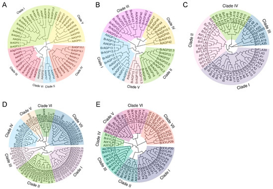 Phylogenetic tree representation of putative AGPs from Brassica rapa (BrAGPs) and Arabidopsis (AtAGPs). (A) Classical AGPs and Lys-rich AGPs. (B) AG-peptides. (C) Fasciclin-like AGPs (FLAs). (D) Phytocyanin-like AGPs (PLAs). (E) Xylogen-like proteins (XYLPs). The neighbor-joining tree was constructed using MEGA X software with 1000 bootstraps. The OmicStudio tool was used to display and manipulate trees.