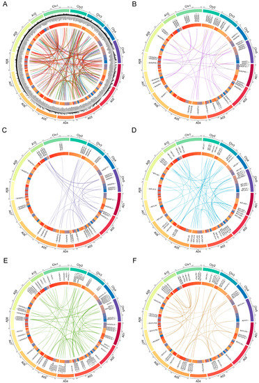 The 24 conserved collinear blocks on the ten chromosomes of the B. rapa genome and the five chromosomes of the Arabidopsis genome were based on previous studies [83,84]. These blocks are labeled A to X and are color coded by inferred ancestral chromosomes following established convention [85]. The position on the blocks and the chromosomal location of each AGP gene were obtained from TAIR and BRAD databases. The tool for syntenic gene analysis, SynOrths, embedded in the BRAD database (http://brassicadb.cn/#/syntenic-gene/, accessed on 1 December 2021), was used to check the duplication of BrAGP genes by searching for homologous genes between Arabidopsis and three B. rapa subgenomes (LF, MF1 and MF2) [58]. The syntenic relationships were illustrated by the OmicStudio tools at https://www.omicstudio.cn/tool/ (accessed on 1 December 2021).