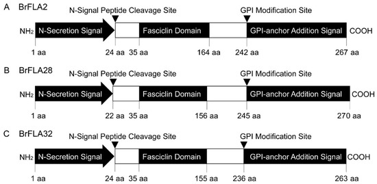 Structure schematic representation of three BrFLA proteins deduced from DNA sequences. (A) BrFLA2. (B) BrFLA28. (C) BrFLA32.