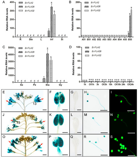 For quantitative real-time PCR, RNA was extracted from floral buds at five developmental stages (stage 1: longitudinal diameter ≤1 mm, stage 2–5: longitudinal diameter approximately at 2.2, 2.6, 3.8 and 5.9 mm, respectively; stage 1–5 represent pollen mother cell stage, tetrad stage, uninucleate stage, binucleate stage and mature pollen stage) [88], roots, stems, young leaves, whole inflorescences, siliques, sepals, petals, stamens, gynoeciums and pistils at 1, 3, 10 and 24 HAP. First-strand cDNA was then synthesized using a PrimeScript® RT reagent Kit with gDNA Eraser (TaKaRa, Beijing, China) as the template. UBC10 was used as the normalization control. Quantitative real-time PCR was performed to analyze the expression level of BrFLA2, BrFLA28 and BrFLA32 with specific primers (Table S6) on a CFX96 Real-time RT-PCR Detection System (Bio-Rad, Hercules, CA, USA). Three technical repeats and three biological replicates were carried out. The values represent means ± standard deviation (SD) of three biological replicates. The relative expression levels were calculated by the 2−ΔΔCt method [89].