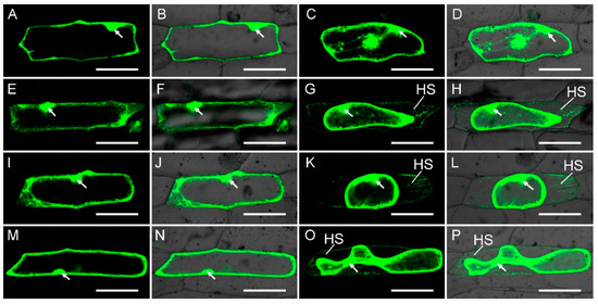Expression of GFP–BrFLA fusion constructs in transgenic onion epidermal cells. Detection of GFP fluorescence in onion epidermal cells expressing pFGC–eGFP (Control) (A–D), GFP–BrFLA2 (E–H), GFP–BrFLA28 (I–L) and GFP–BrFLA32 (M–P) before (A,B,E,F,I,J,M,N) and after (C,D,G,H,K,L,O,P) treatment with 0.3 g·mL−1 sucrose for 3 min. White arrows indicate the nuclei of onion epidermal cells. HS, Hechtian strands. Scale bars = 100 μm.