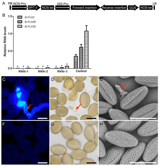 A case in AGP40, a pollen-specific AG-peptide, in which the null mutant shows no alteration in pollen grain development but illustrates a reduction in pollen grain fitness [59], and an early pollen germination in agp6 agp11 null mutants inside the anther [40] gave us a clue and encouraged anther experiments to further investigate this phenotype. We placed the BrFLA2/28/32–RNAi transgenic plants and control plants in chambers with an 85% relative humidity. After 3 d, dehiscent pollen was gathered and stained with aniline blue. Light microscopy revealed that approximately 9.5% of pollen grains germinated precociously in the anthers of BrFLA2/28/32–RNAi transgenic plants, with prominent callose fluorescence signals in the pollen tubes detected by aniline blue (Figure 7C,D), whereas dehiscent pollen from control plants had negligible callose staining within the grains (Figure 7F,G). Scanning electron microscopy further confirmed the result of aniline blue staining that early germinated pollen tubes from BrFLA2/28/32–RNAi transgenic plants were discernible (Figure 7E) and there was no pollen tube outgrowth in the anthers of control plants (Figure 7H). This dramatic phenotype suggests that high humidity can affect the BrFLA2/28/32–RNAi phenotype, enhancing early pollen germination in the anthers.