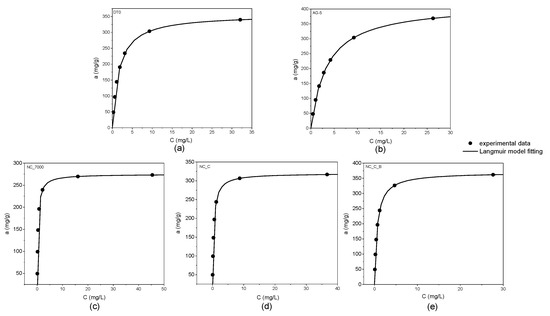 According to the IUPAC classification, the adsorption isotherms shown in Figure 2 are of I type. The graphs below demonstrate the excellent agreement of the experimental data with the Langmuir equation (R2 > 0.99).