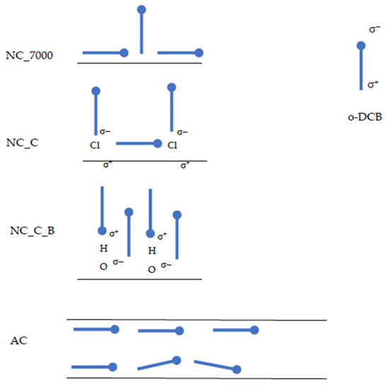 We suppose that o-DCB molecules are placed horizontally on the surface of activated carbons. In the case of carbon nanotubes, higher values of Sc indicate that a monolayer may be formed, with some particles arranged vertically and some horizontally. This phenomenon may be due to the microporosity of the activated carbons. In pores smaller than 1.5 nm, the particles cannot orient themselves vertically. In contrast, o-DCB adsorbs on the outer surface of carbon nanotubes. This enables easier vertical orientation of the adsorbate molecules. Moreover, the modification of the carbon nanotube surfaces enhances this effect. The chlorine atoms and hydroxyl groups introduced on the CNT surfaces cause polarization on the surface. The presence of strongly electronegative chlorine atoms in the o-DCB molecule also cause its polarization, forming a dipole. Graphically, this process is shown in Figure 4.