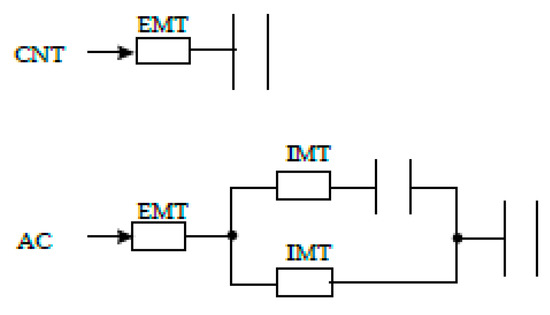 Scheme mass transfer of o-DCB to CNTs and ACs surfaces. EMT, external mass transfer; IMT, internal mass transfer. The resistor symbol represents the mass transfer resistance, and the capacitor symbol the adsorption capacity of the adsorbent.