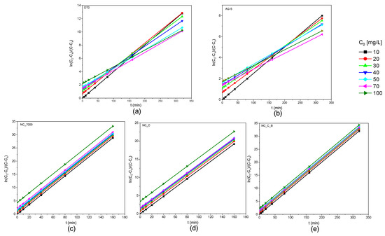 Kinetic curves of o-DCB adsorption onto DT0 (a), AG-5 (b), NC_7000 (c), NC_C (d), and NC_C_B (e) in linear form.
