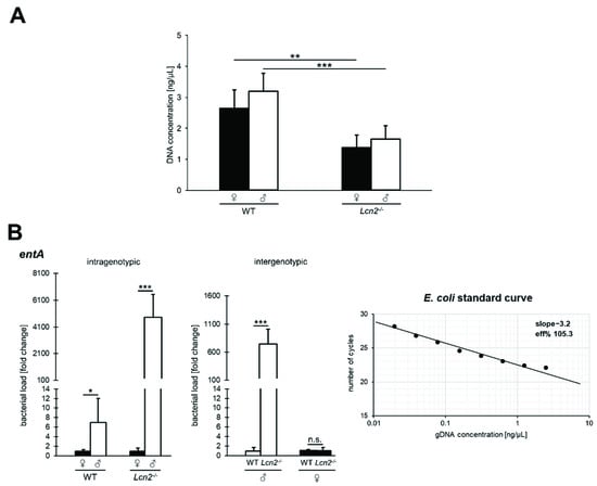 Concentration of total and intestinal DNA abundance in murine feces. (A) After extraction, the dsDNA concentration was fluorometrically determined by Qubit® assay. The bars represent the arithmetic mean of the individual measurements (± SD; Lcn2-/- (n = 7 or 5) and wild type mice (n = 7 or 3)). Statistical evaluation was performed by an unpaired t-test, whereby the difference of two samples from a level of p < 0.05 is considered statistically significant (**: p < 0.01, ***: p < 0.001). (B) Investigation of the intestinal abundance of entA-coding bacteria using qPCR. The data were normalized using an E. coli standard curve (right). Grouped bars represent the fold change ratio between two data sets (± SD; Lcn2-/- (n = 7 or 5) and wild type mice (n = 7 or 3)), with the wild type defined as 100%. Statistical evaluation was performed by unpaired t-test, whereby the difference between two samples from a level of p < 0.05 is considered statistically significant (*: p < 0.05, ***: p < 0.001; n.s. = not significant; Eff% = efficiency [%]).