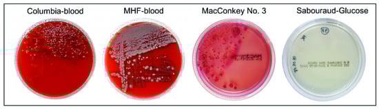 Cultivation of microorganisms from murine feces. Representative pictures of the heterogeneously overgrown Columbia and MHF blood agar (microaerobic, 37 °C), MacConkey No. 3 agar (aerobic, 37 °C), as well as the non-overgrown Sabouraud glucose agar (aerobic, room temperature) used to isolate individual bacterial species. From these and similar plates, colonies of different phenotypes were cultured in pure culture, isolated, and then identified by matrix-assisted laser desorption/ionization-time of flight (MALDI-TOF) mass spectrometry.