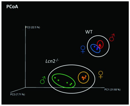 Principal coordinates analysis (PCoA) of the intestinal tract microbial community. Depicted are the unweighted UniFrac distance metrics between microbial communities of the intestinal tract of Lcn2-/- and WT mice of both sexes. The three-dimensional visualization of the sequencing data was performed with the EMPeror software. Each point represents a single sample that is displayed in the same color within a group.