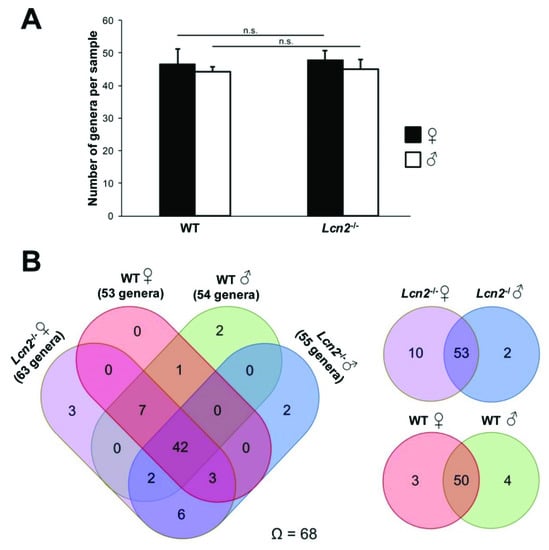 Gender-specific diversity and genus spectrum of the intestinal microbiome of Lcn2-/- and wild type mice. (A) The bars represent the arithmetic mean of the genera per sample (± SD; Lcn2-/- (n = 7 or 5) and wild type mice (n = 7 or 3)). Statistical evaluation was performed using the Kruskal–Wallis test, whereby the difference of two samples from a level of p < 0.05 is considered statistically significant (n.s. = not significant). (B) Venn diagram showing shared genera between the different groups by absolute numbers (Ω = total number of genera).