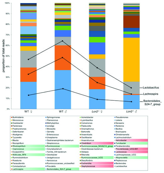 The relative abundance of Alloprevotella, the Bacteroidales_S24-7_group, Coprococcus, Lachnospira, Mollicutes_RF9, Rhodospirillum, the Ruminococcaceae_NK4A214_group, Ruminococcaceae_UCG, and Ruminococcus was significantly decreased in the Lcn2 nulls compared to the wild type (p < 0.05), whereas the degree of group-related significances varied depending on gender. In male Lcn2-/- mice, the genera Rhodospirillum, Ruminococcus, and Turicibacter were completely absent. Despite large differences in Turicibacter levels between male and female wild type mice, no genotype specific significances were found. In Lcn2 nulls, the decrease in female (~65-fold) mice was statistically proven (p < 0.05). The gender-specific differences in Coprococcus, the Ruminococcaceae_NK4A214_group, and Turicibacter within the wild type mice were significant (p < 0.05). Turicibacter was the only genus that was more abundant in female wild type mice than in males. The decrease in the relative abundance of Coprococcus, Lachnospira, Rhodospirillum, and Ruminococcaceae_UCG in the mutant had also gender-specific characteristics. The 13:1 ratio of the genus Lachnospira (~11.6%), which was strongly represented in female knockout mice, was particularly striking. This genus colonized the male intestine much more weakly (~0.9%) and its proportion was decreased 26 times compared to the wild type (23.4%). The Bacteroidales_S24-7_group and Ruminococcus showed no statistically significant gender-specific differences. In addition, the proportion of the Bacteroidales_S24-7_group in the knockout with 13.3% (male) and 18.7% (female) was still higher than 10% of the total reads and decreased by a factor of 2.8 and 1.4, respectively.