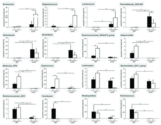 Representatives of the genera Escherichia (11.5%) and Staphylococcus (41.4%) were more significantly (p < 0.05) represented in male knockout mice than in wild type and female knockouts. The increase in relative abundance of Prevotellaceae_UCG-001 (female: 1.1%, male: 0.42%) and Lactococcus (female: 0.63%, male: 1.9%) in Lcn2-/- mice was also statistically significant (p < 0.05). The same applied to the obtained gender differences within the Lcn2 null mice, whereas the proportion of Prevotellaceae_UCG-001 was higher by a factor of 2.6 in females than in males. In contrast, the proportion of the genera Escherichia (~200-fold), Lactococcus (~3-fold), and Staphylococcus (~10-fold) in male mice was higher than that in females. Clostridium (female: 0.39%, male: 0.15%) and Helicobacter (female: 0.22%, male: 0.12%) were more abundant in the intestine of knockout mice compared to wild type mice (p < 0.05). However, no statistically significant gender differences were found.
