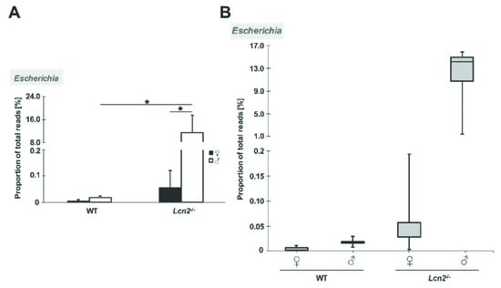 Frequency distribution of the data using the example of the genus Escherichia. (A) Percentage of total reads [%] in the different genders and genotypes (Lcn2-/- (n = 7 or 5) and wild type mice (n = 7 or 3)). (B) The relative abundance is plotted as a percentage of the total reads [%]; 50% of the mean data lie within the boxes. In the box plot, the whiskers range from the quartiles to the minimum or maximum including outliers is shown. *: p < 0.05.
