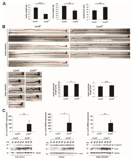 Comparative analysis of the intestine macroscopical parameters and expression of Lcn2 in wild type (n = 4) and Lcn2-/- mice (n = 4 or 5). (A) Evaluation of the body weight of male animals at the same age (left). Corresponding ceca were prepared and weighed (middle). Ratio of body to cecal weight (right). (B) Gross macroscopical and graphical comparison of the total small and large intestinal lengths measured (n = 4 or 5). (C) Quantitative analysis of Lcn2 mRNA (upper) and LCN2 protein expression (lower) in the distal small intestine (left) cecum (middle), and distal colon (right) of wild type (Lcn2+/+) and Lcn2 null mice (each n = 4 or 5). Relative mRNA expression of respective genes was done by RT-qPCR and normalized to Gapdh or β-actin. Equal protein loading was demonstrated by re-probing the membranes with a specific antibody directed against GAPDH or β-actin. E-cadherin was probed as a marker for epithelial-to-mesenchymal transition (EMT). Primers used are given in Supplementary Table S1. Statistical evaluation in (A–C) was performed by an unpaired t-test, whereby the difference of two samples from a level of p < 0.05 is considered statistically significant (*: p < 0.05, **: p < 0.01, ***: p < 0.001).